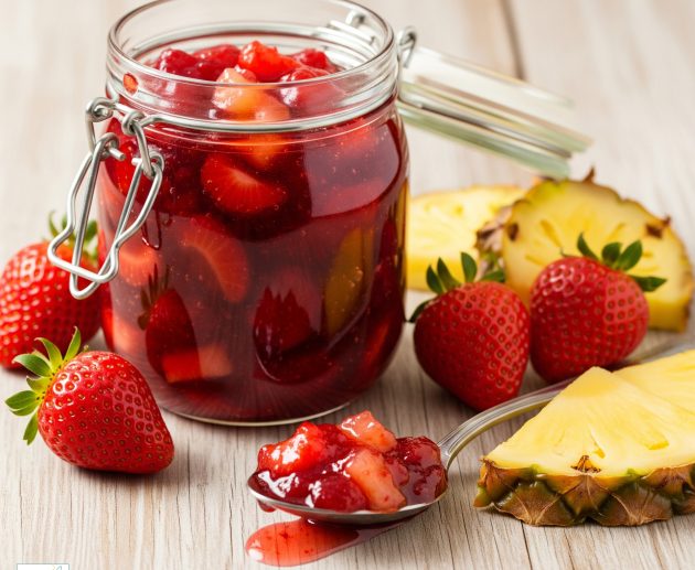 Acest gem de căpșuni și ananas este combinația perfectă dintre fructele clasice și cele exotice. Gustul dulce-acrișor al căpșunilor se