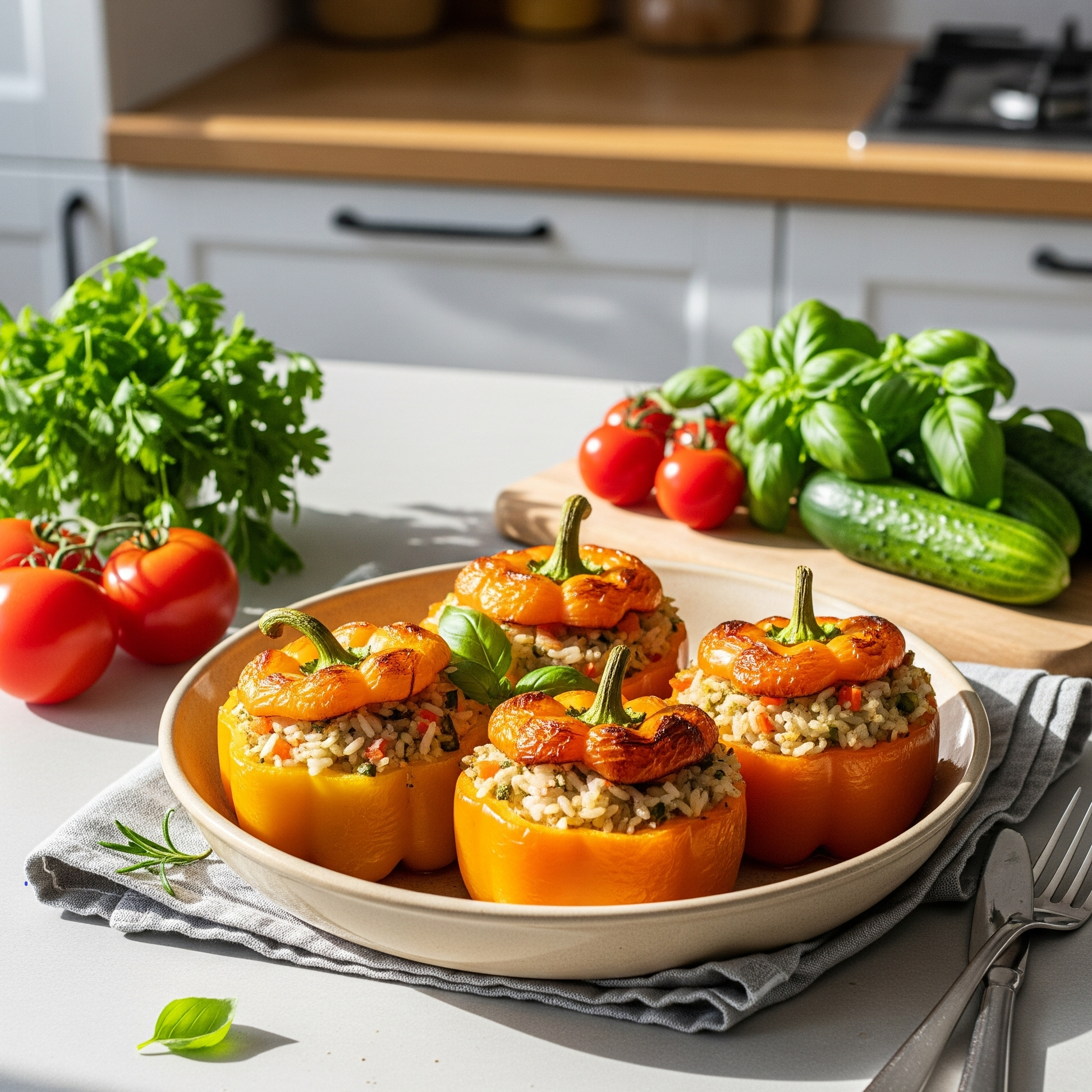 Ardei grași umpluți cu orez și legume, copți în tavă