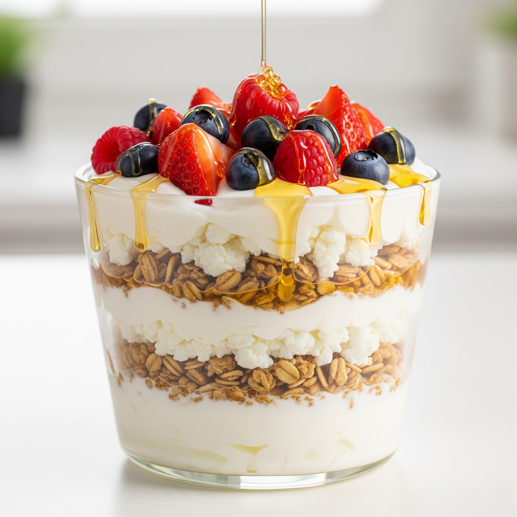 O combinație cremoasă și crocantă, acest preparat cu iaurt, brânză de vaci și granola este o alegere echilibrată, gustoasă și ușor de personalizat. Straturile de ingrediente oferă atât textură, cât și un aspect apetisant, iar fructele proaspete și mierea adaugă un plus de prospețime și dulceață naturală. Este o rețetă versatilă, care se poate adapta în funcție de preferințe sau sezon — ideală pentru un început de zi energic sau ca gustare nutritivă.
