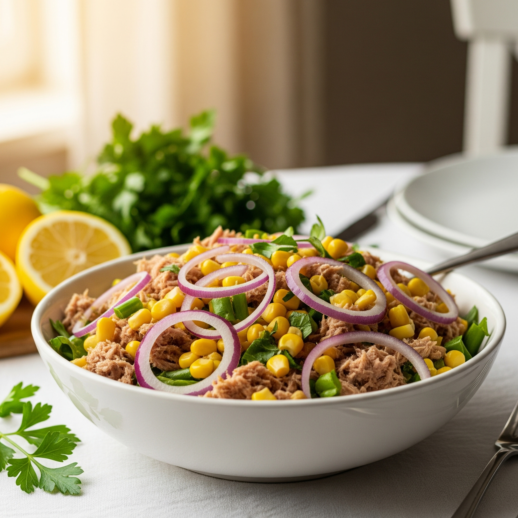 Salata de ton cu porumb și ceapă roșie este un preparat rapid, proaspăt și plin de gust, perfect pentru zilele când vrei ceva ușor și răcoritor. Combinația dintre tonul sățios, dulceața porumbului și aroma ușor picantă a cepei roșii, îmbrăcată într-un dressing cremos de maioneză sau iaurt, transformă această salată într-o alegere excelentă pentru platourile cu aperitive, fiind ideală ca salată de început de masă.