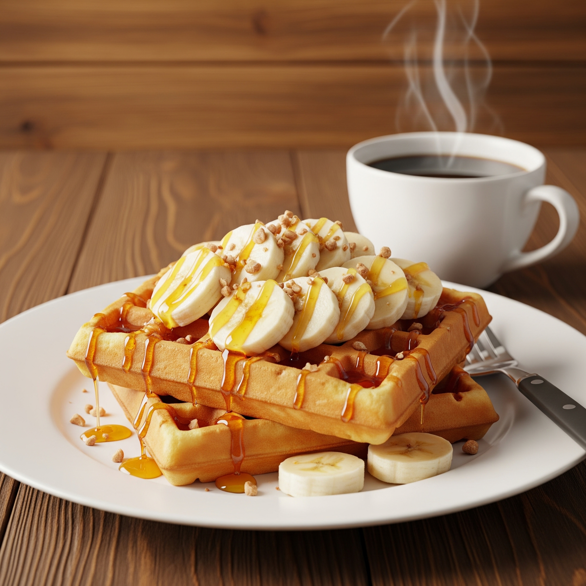 Servește vafele calde, stropite cu miere și presărate cu nuci. Opțional, adaugă felii de banană proaspătă, fructe de pădure sau iaurt pentru un plus de prospețime.